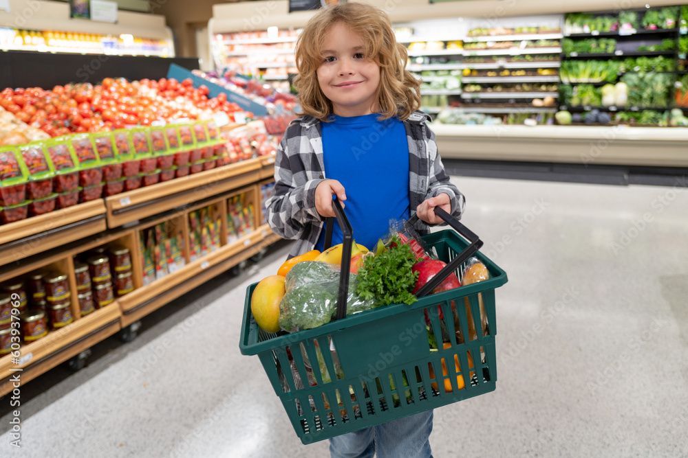 Portrait of child with shopping cart full of fresh vegetables in a food store. Supermarket shopping and grocery shop concept. Shopping kids. Child buying grocery in supermarket. hold shopping basket.