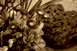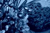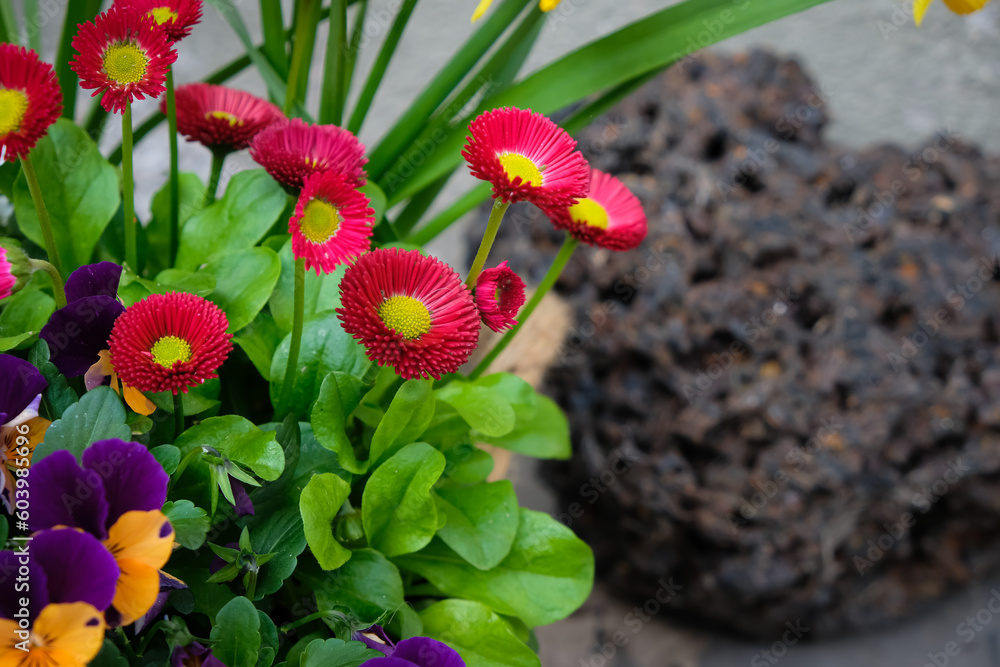 Pink daisies. Volcanic stone. The home yard decoration. Copy space.