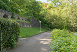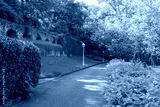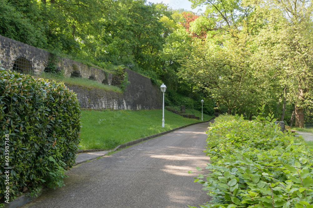 Romantic alley for walks in the city park. Antique white lampposts along a hiking trail