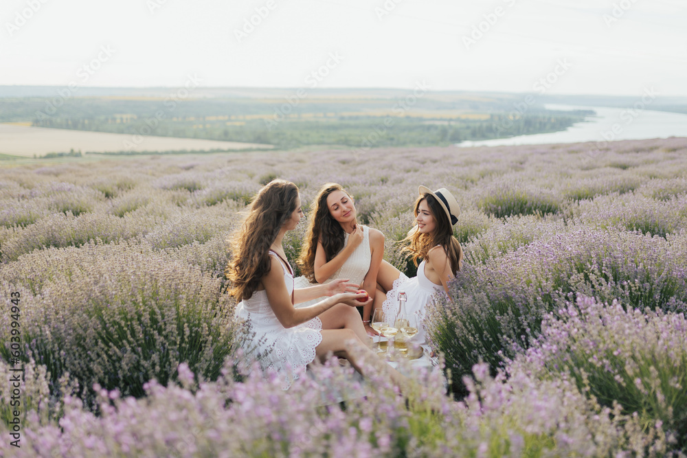 Girlfriends enjoying their time together on a picnic lavender field. Leisure and free time. Copy space.