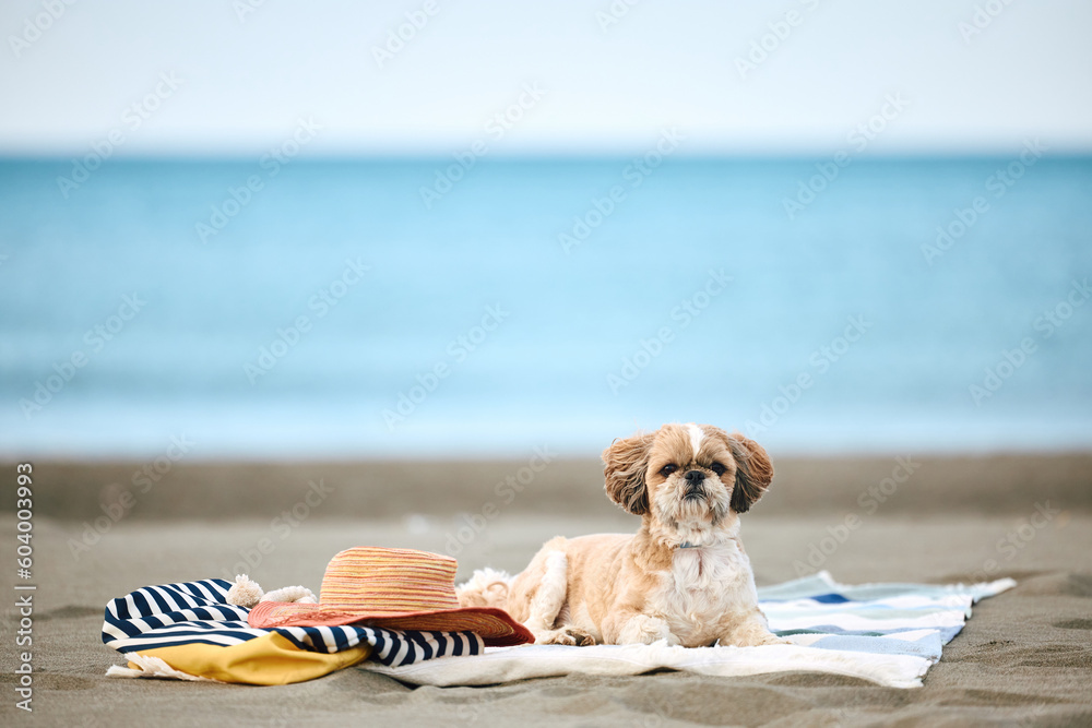 Shih Tzu dog relaxing on beach towel and looking at camera.