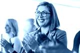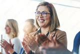 Applause, meeting and conference with business woman for support, teamwork and event celebration. Wow, winner and target with audience clapping in workshop seminar for goal, motivation or agreement