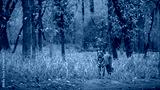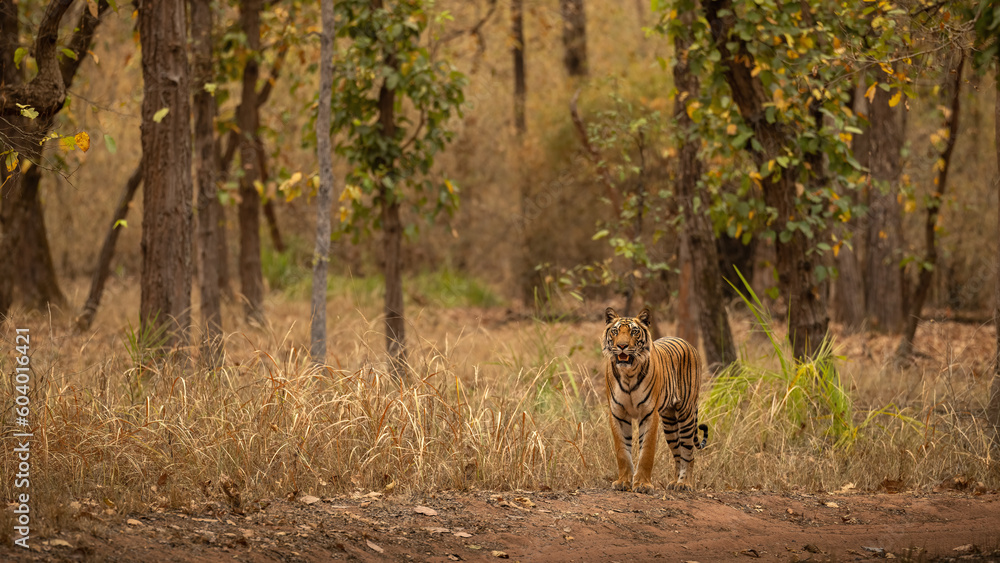 Wild tiger in the nature habitat. Tigers walking during the golden light time. Wildlife scene with danger animal. Hot summer in India. Dry area with beautiful indian tiger, Panthera tigris tigris.
