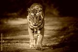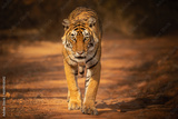 Wild tiger in the nature habitat. Tigers walking during the golden light time. Wildlife scene with danger animal. Hot summer in India. Dry area with beautiful indian tiger, Panthera tigris tigris.