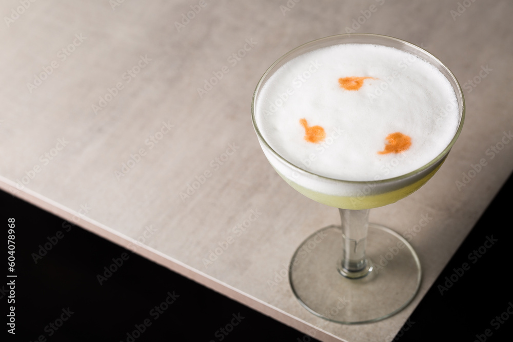 Pisco Sour Cocktail booze pisco, fresh lemon juice, syrup, egg white and aromatic bitters