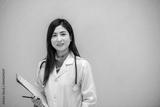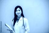 Woman female doctor portrait in white coat gown with stethoscope, waist up. Medical student attractive friendly smiling clinic arms crossed wear white lab coat smiling in patient room