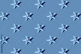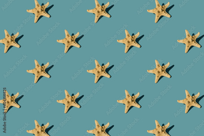Starfish on green background with shadows. Summer pattern vacation banner concept