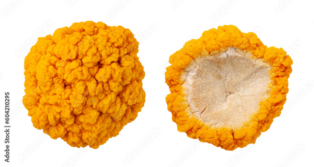 fresh golden ear mushroom or tremella mesenterica (yellow brain fungus) isolated on white background.