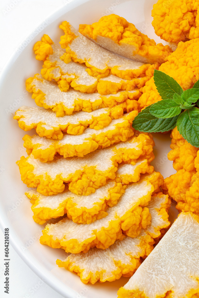 close up of sliced yellow brain fungus or golden ear mushroom in a dish.