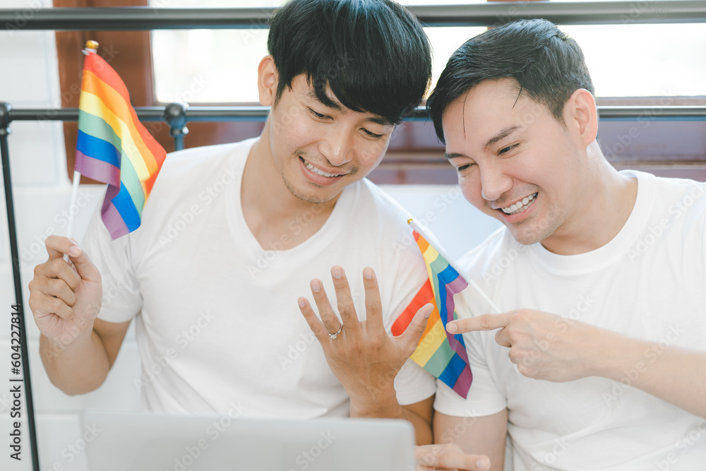 Happy engaged asian gay couple waving lgbt rainbow flag and VDO call to share happy moment at bedroom. happy married homosexual gay couple. Young Asia Gay couple feeling happy showing ring at home.
