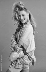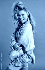 80s fashion, retro style and woman portrait with vintage, neon and happiness in a studio. Blue background, female person and jacket of a model with workout, fitness and training outfit with a smile