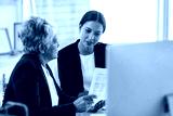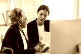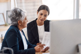 Mentor, coaching or business women with documents talking, speaking or planning project in office. Paperwork, teamwork collaboration or senior manager reading with intern for administration training