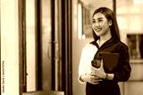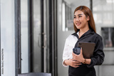 Successful businesswoman holding tablet and mobile phone standing in office.