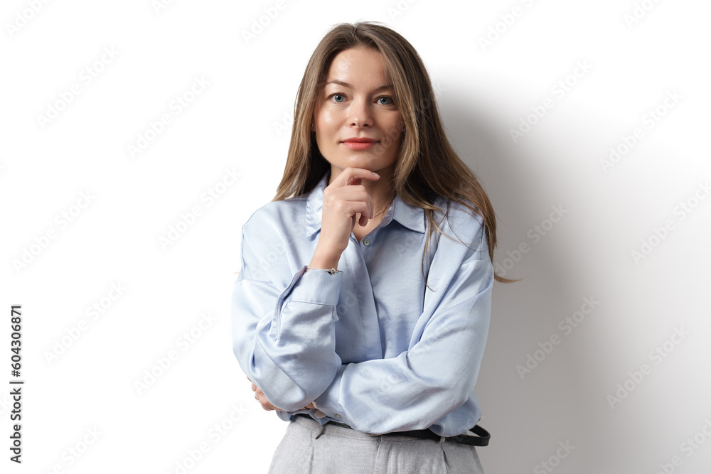 Young caucasian woman, professional entrepreneur standing in office clothing, smiling and looking confident on white background