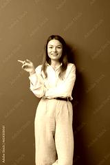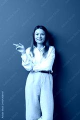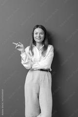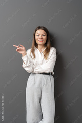 Happy young businesswoman posing and pointing to empty copy space isolated over grey wall background. A studio shot of an adult woman standing with a smiling expression