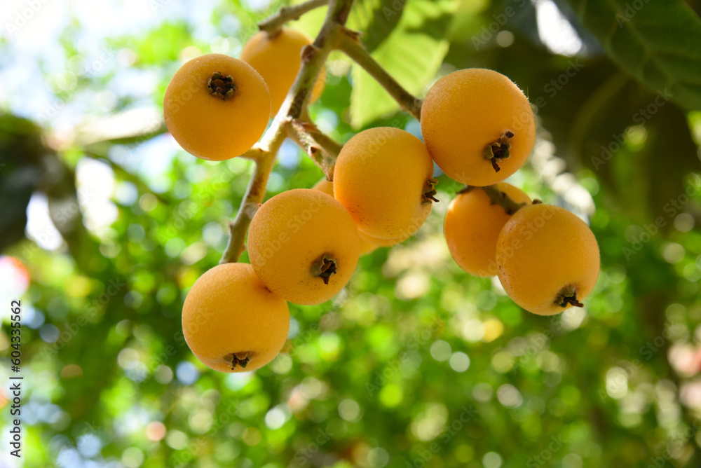 Loquat tree branch with ripe fruits, closeup on dark green leaves background. Eriobotrya japonica. Bright orange-yellow fruit of Japanese medlar, Malta plum, harvest in sunny organic garden. Greece.