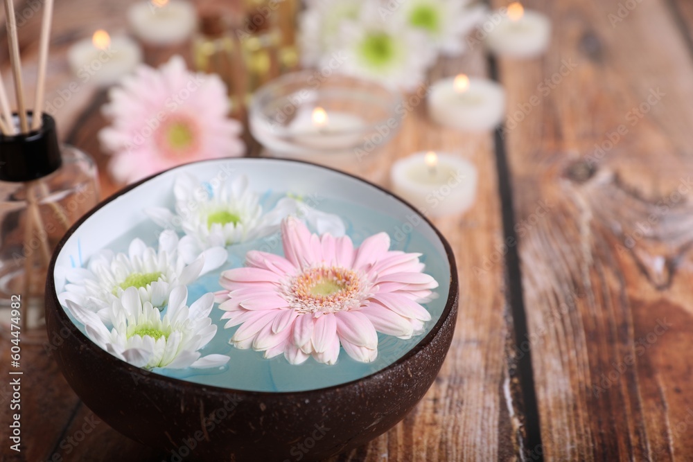 Spa composition. Bowl with water and beautiful flowers on wooden table, closeup. Space for text
