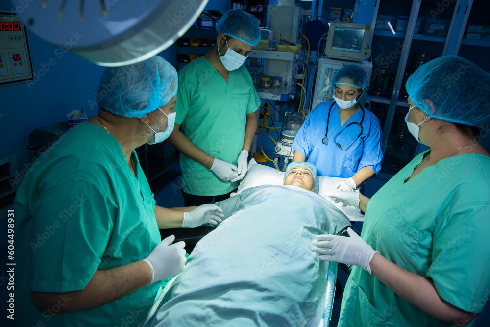 Indian surgeons medical team performing surgery in operation theater at hospital. Healthcare in india concept. Emergency