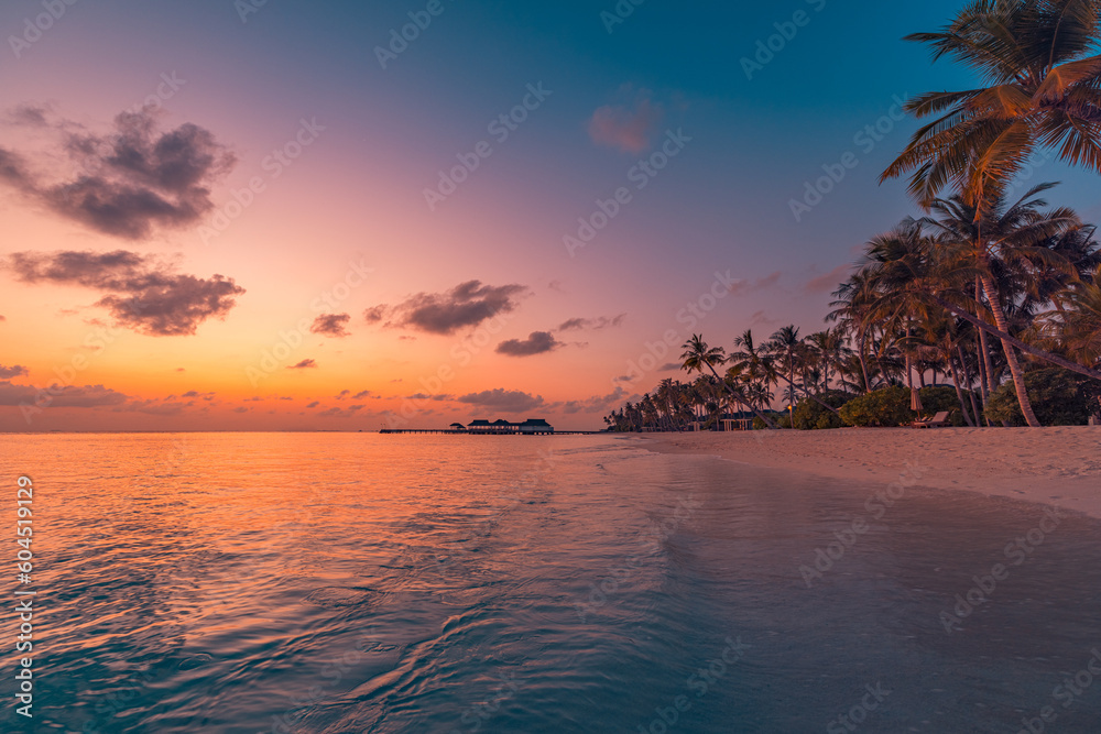 Paradise island palm trees sea sand beach. Panoramic beach travel landscape. Inspire tropical beach seascape horizon. Orange golden sunset sky calm tranquil relaxing summer vacation. Exotic holiday