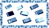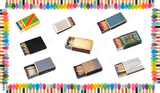 a collection of matchboxes with a frame made by matchsticks various colors on white background