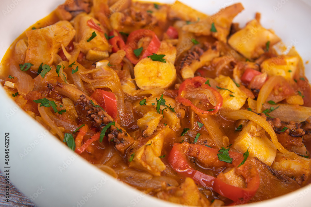 Recipe for octopus Provencal style, tomato, onion, garlic, red pepper, parsley, High quality photo