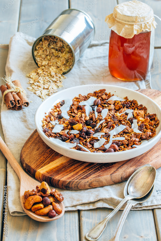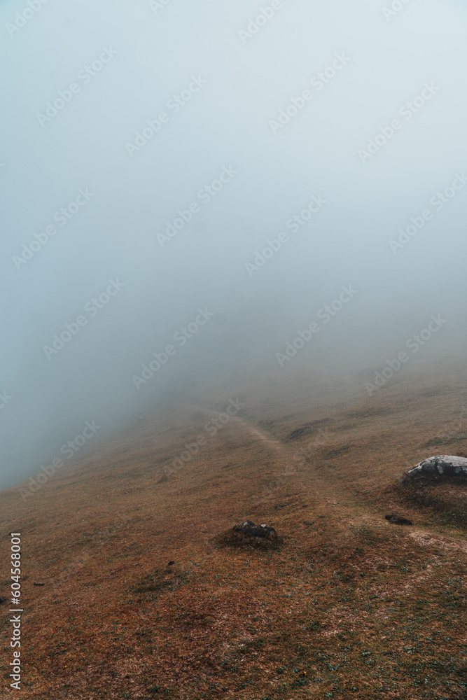 From above of arched old thick tree growing on grassy field in woods on misty day in madeira