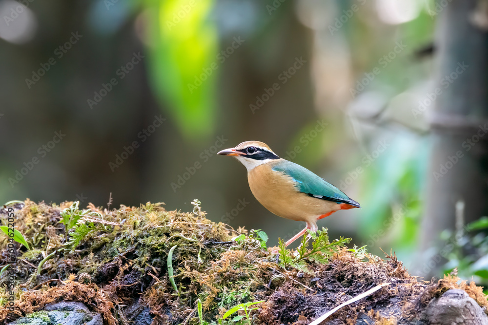 An Indian pita bird perched on a small platform in the coffee estate on the outskirts of Thattekad, Kerala