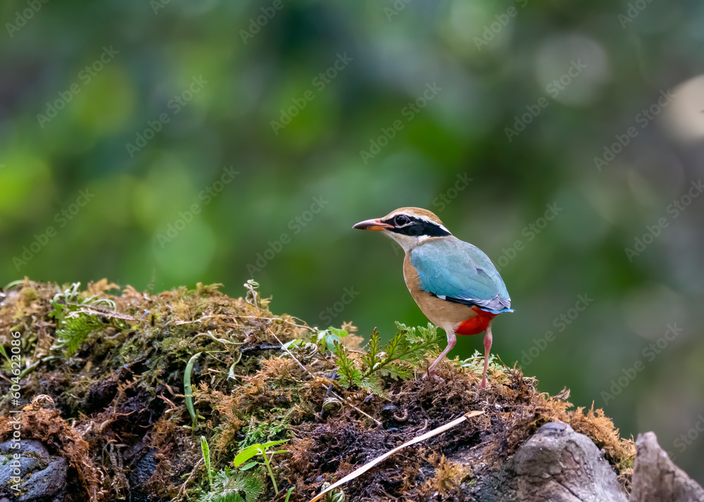 An Indian pita bird perched on a small platform in the coffee estate on the outskirts of Thattekad, Kerala