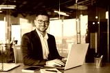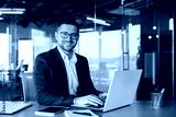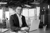 Portrait of a successful male businessman, banker, financial director sitting in the office at the table and using a laptop. Looking and smiling at the camera