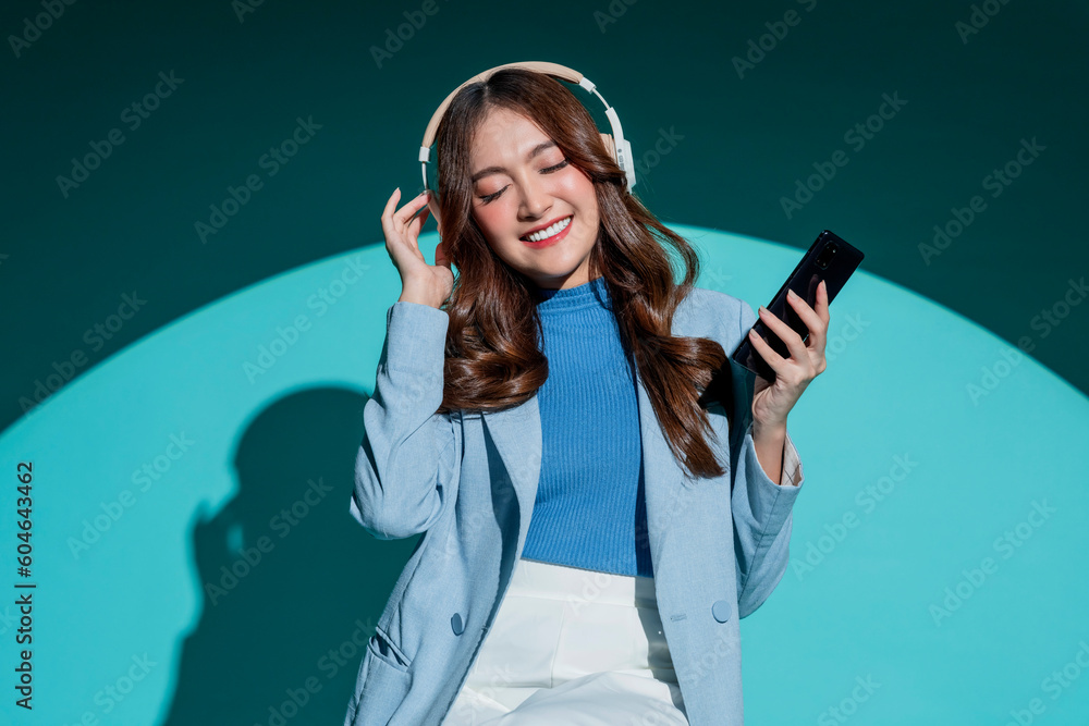 carefree smiling peaceful moment Asian female woman listen music playlist smartphone wireless headphone smart casual device technology ,woman hand choosing playlist from application leisure lifestyle