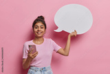 Horizontal shot of cheerful Indian woman smiles toothily being in good mood uses smartphone for chatting online holds white speech bubble for placing your idea dressed casually isolated over pink wall