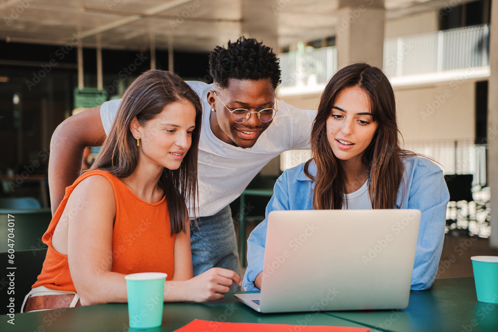 Group of multiracial happy teenage students using laptop, working on university assignment homework project in college library. Meeting of diverse young people looking information on computer. High