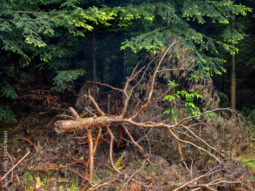 Wiosenny, zielony las o poranku we mgle