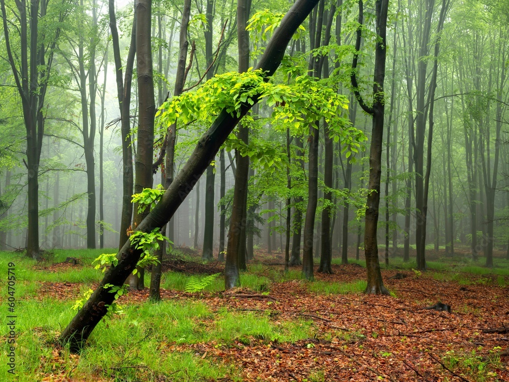 Wiosenny, zielony las o poranku we mgle