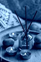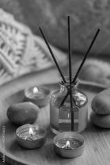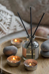 Aromatherapy, atmosphere of relax, serenity and pleasure. Concept of spa treatment in salon. Natural organic essential oil, towel, burning candles. Anti-stress, detox procedure, wellness