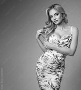 Beautiful Blond Girl in Cocktail Dress. Fashion Model with Wavy Hair and perfect Makeup over Gray Background. Elegant young Woman Portrait in Party Gown