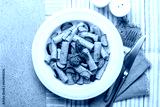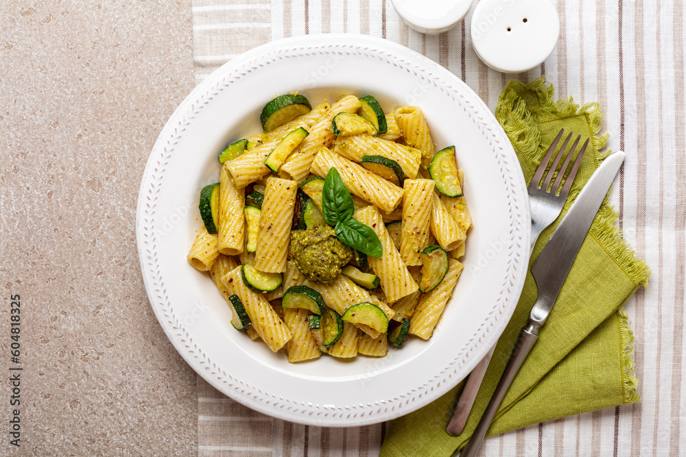Top view of vegan tubular pasta dish, pistachio pesto rigatoni with zucchini.