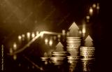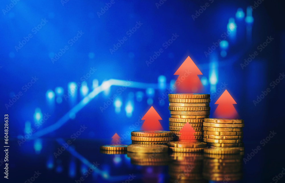 Growth financial business arrow money coin on increase earnings background with economy market investment finance banking profit or success cash stack currency of wealth graph price value strategy.