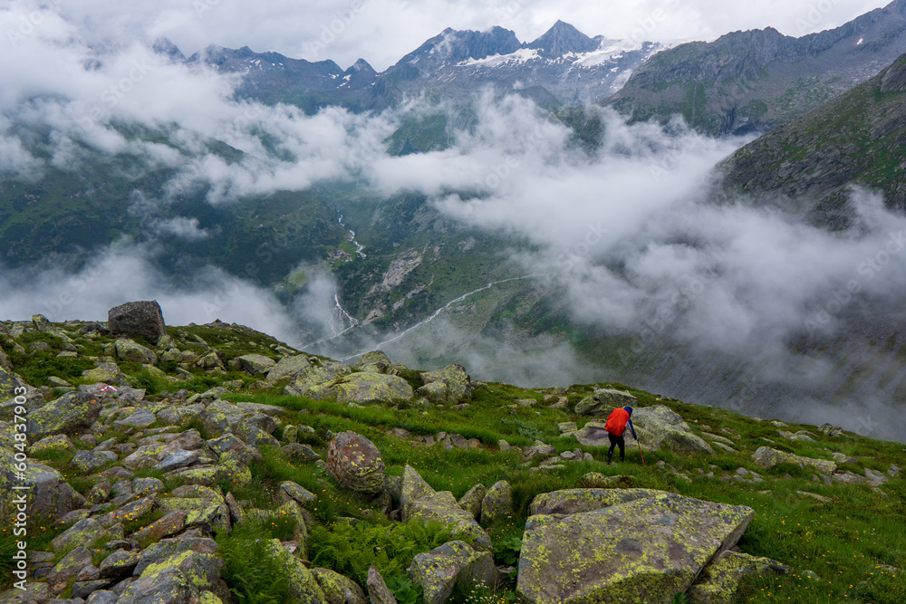 Hiking - hiker woman on trek with backpack living healthy active lifestyle. Hiker girl walking on hike in mountain nature landscap, zirrel aps, Austria alps, Switzerland.