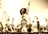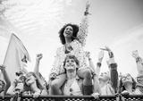 Cheering woman on man shoulders at music festival