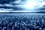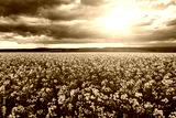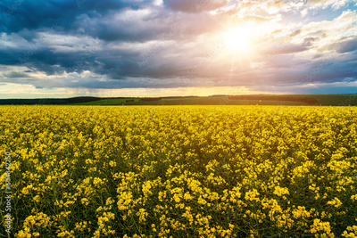 The sun breaking through storm clouds in a flowering rapeseed field.