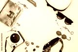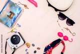 summer travel accessories. women's set of adult toys, camera, hat, glasses on a light background. space for your text