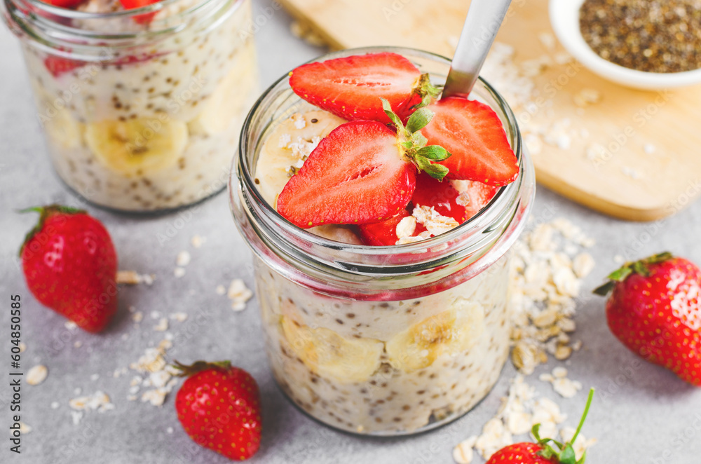 Overnight Oats with Fresh Strawberry, Banana and Chia Seeds in Jars on Light Grey Background, Healthy Snack or Breakfast