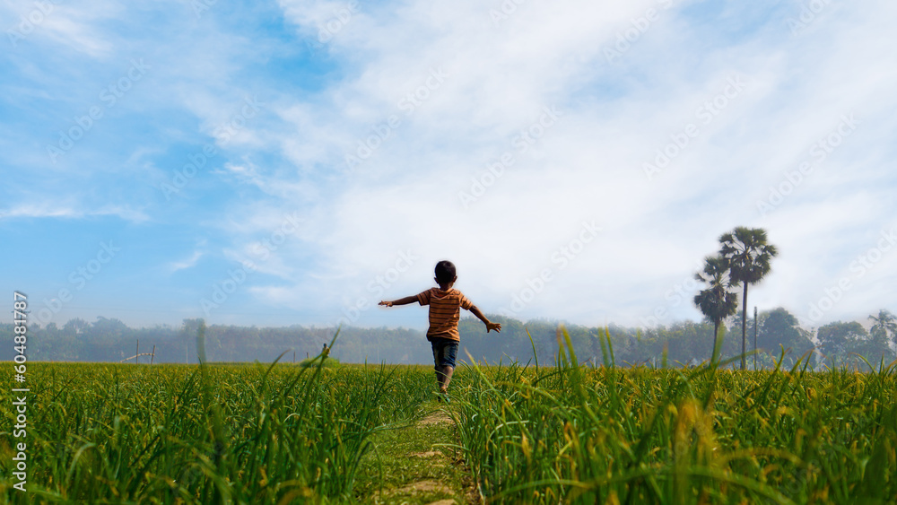 A child dances with nature on a rural path. Children in the village of Bangladesh play in the field.