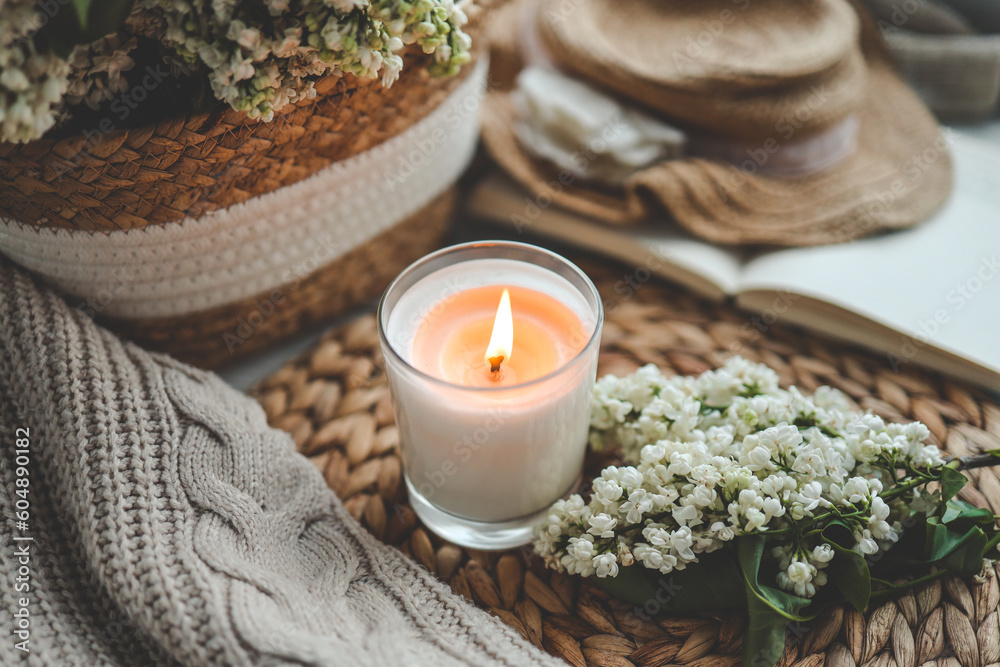 Burning candle in spring interior
