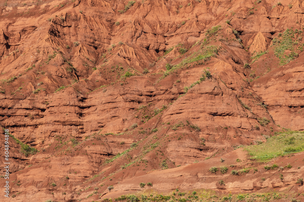 Natural clay red background.Red clay hill structure.Soil erosion process.