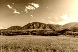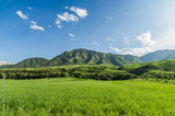 Green meadow against the backdrop of green hills. Blue sky with clouds.Journey into the wild.