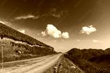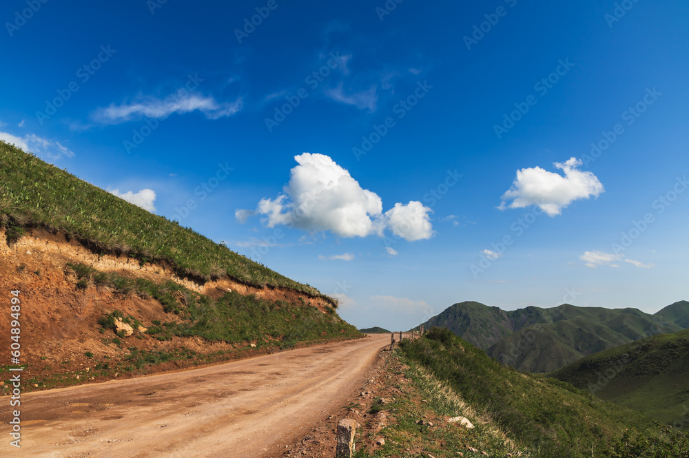 Mountain country dirt road on a sunny day.Blue sky with clouds.Travel to the wild.