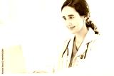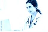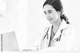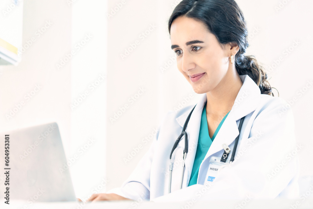 Beautiful and professional female doctor using laptop computer, working at her desk in the doctor's office.