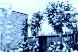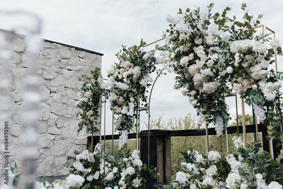 Wedding arch decorated with white flowers and greenery at the wedding ceremony in the fresh air.